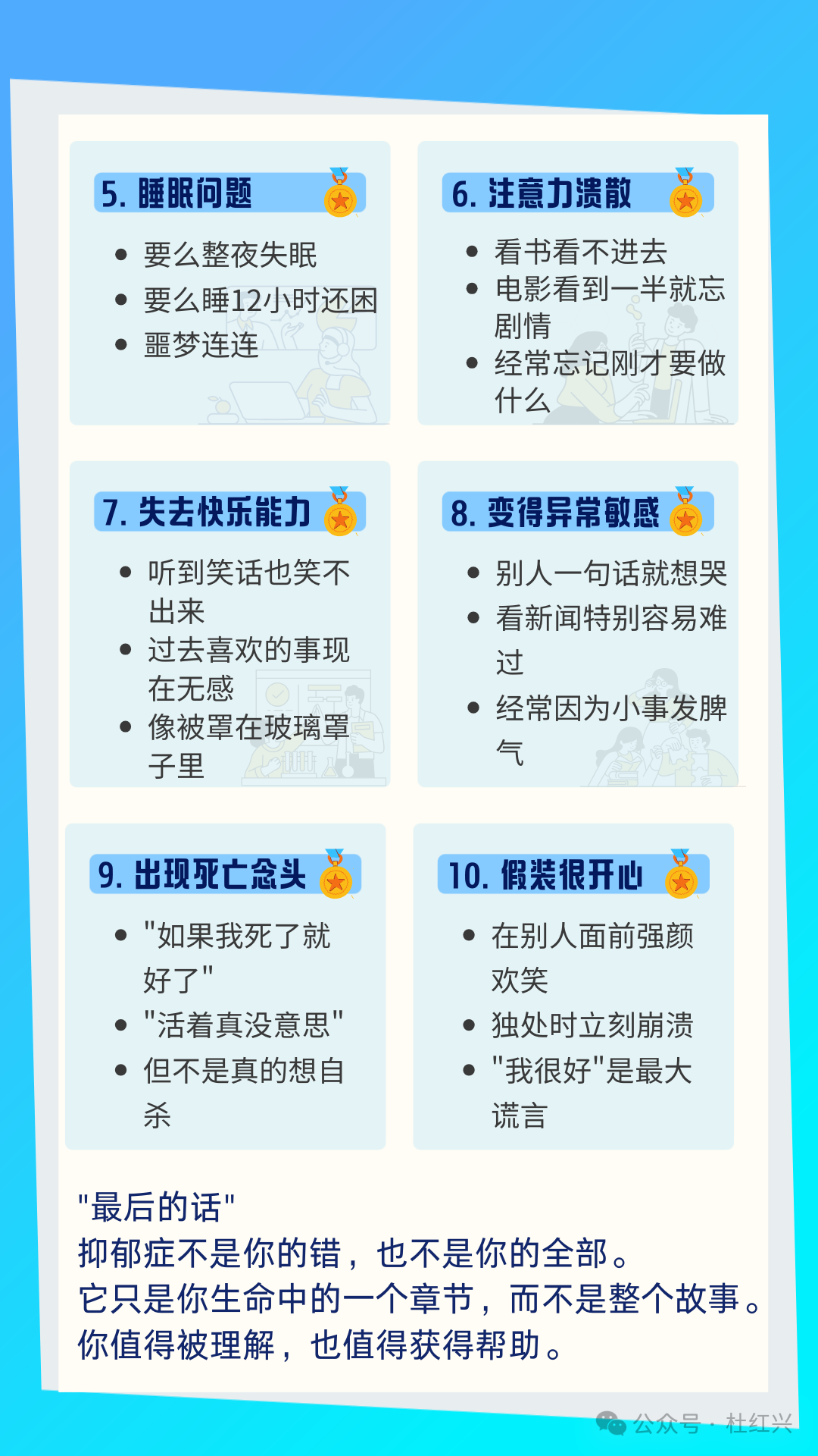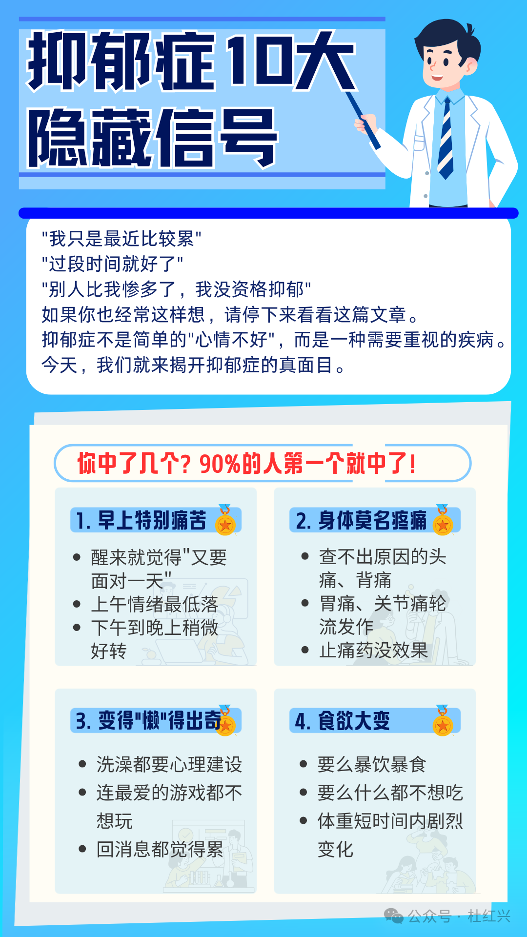 抑郁症的10个隐藏信号,你中了几个?90%的人第一个就中了! 本篇文章来源于微信公众号: 沈阳精神科杜主任 预约挂号 发布于 心理 上篇文章: 杜红兴 | 这7个不对劲的表现可能是精神病前兆!杜主任教你区分"性格怪"和"真有病" 下篇文章: 杜红兴 | 失眠救星!杜主任亲授"倒头就睡"秘诀,今晚就能试 发表回复 取消回复评论 * 显示名称 * 邮箱 * 网站 在此浏览器中保存我的显示名称、邮箱地址和网站地址,以便下次评论时使用。