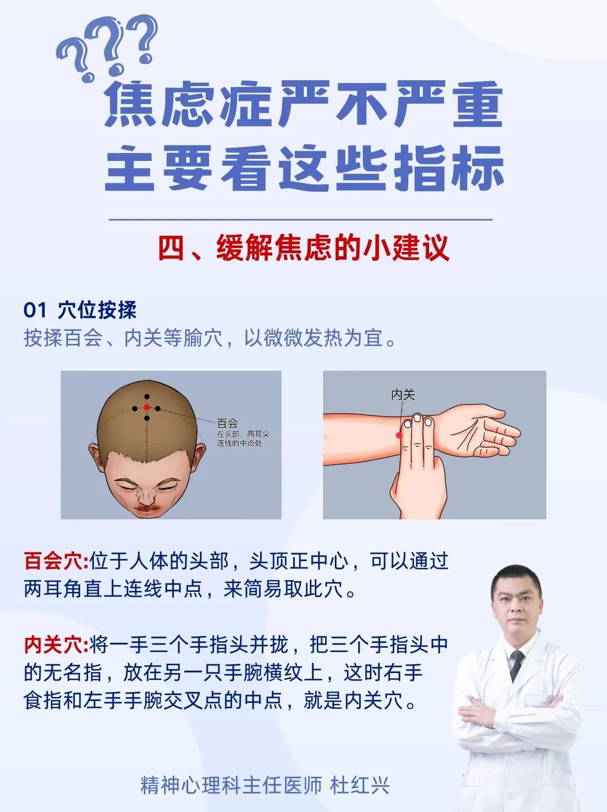 缓解焦虑的小建议01 穴位按揉按揉百会、内关等腧穴,以微微发热为宜。百会穴:位于人体的头部,头顶正中心,可以通过两耳角直上连线中点,来简易取此穴。内关穴:将一手三个手指头并拢,把三个手指头中的无名指,放在另一只手腕横纹上,这时右手食指和左手手腕交叉点的中点,就是内关穴。02 健康饮食食用多糖类及全谷类的食物及蛋白质,如糙米、大麦、小麦等,它们可使脑部产生安定作用蜂蜜能舒缓压力、 改善情绪;黄豆、慧米、山楂、苹果、大枣等归脾经的食材,有健脾益胃放松心情的功效。03 适当运动运动可以使精神放松,心情愉悦。练可八段锦,太极拳等运动,调身静心,安神益智。04 舒缓神经的娱乐性活动切忌不要用刺激神经比如看恐怖电影、血腥暴力视频这类活动来作为放松的方式听听舒缓音乐散散步是很不错的选择。还可以加入一些小群体,大家能在一起聊天唱歌的那种。05 作息规律你可以每天熬夜 ,但是要记得规律就好。身体适应一个作息以后不要随便的破坏这样你的神经会被折磨。06练习深呼吸把精神集中于呼吸过程中,这也可以缓解你的心跳率,并忘记你的焦虑。仰躺两手放在腹部。慢慢地吸气,通过您的鼻子,让你的腹部膨胀,犹如气球一样。然后用嘴慢慢呼气,并感受腹部紧缩。持续8-10个吸入和呼出周期。每天至少练习两次,一次在上午,一次在晚上。