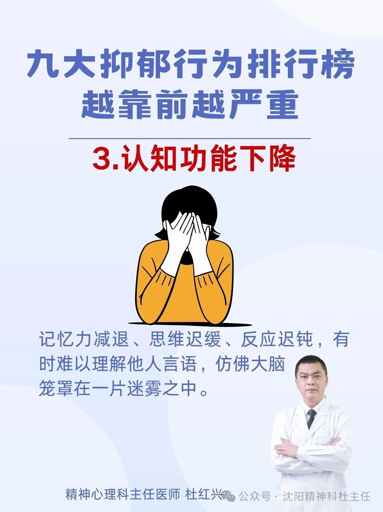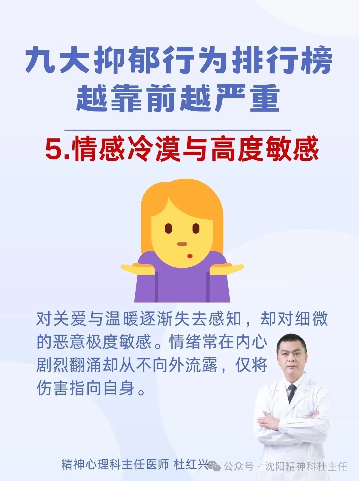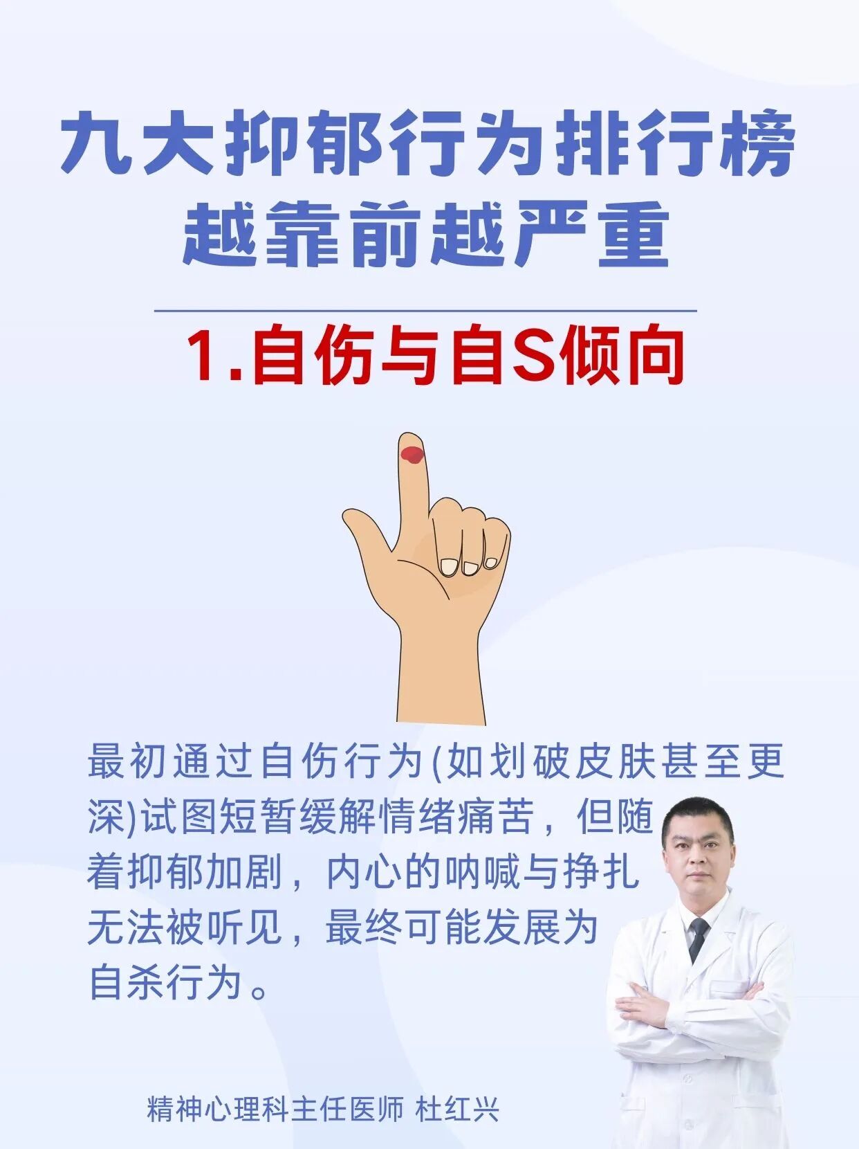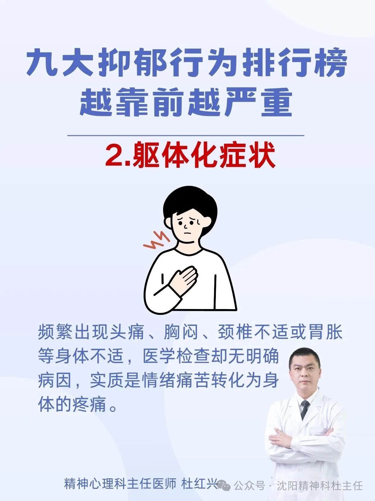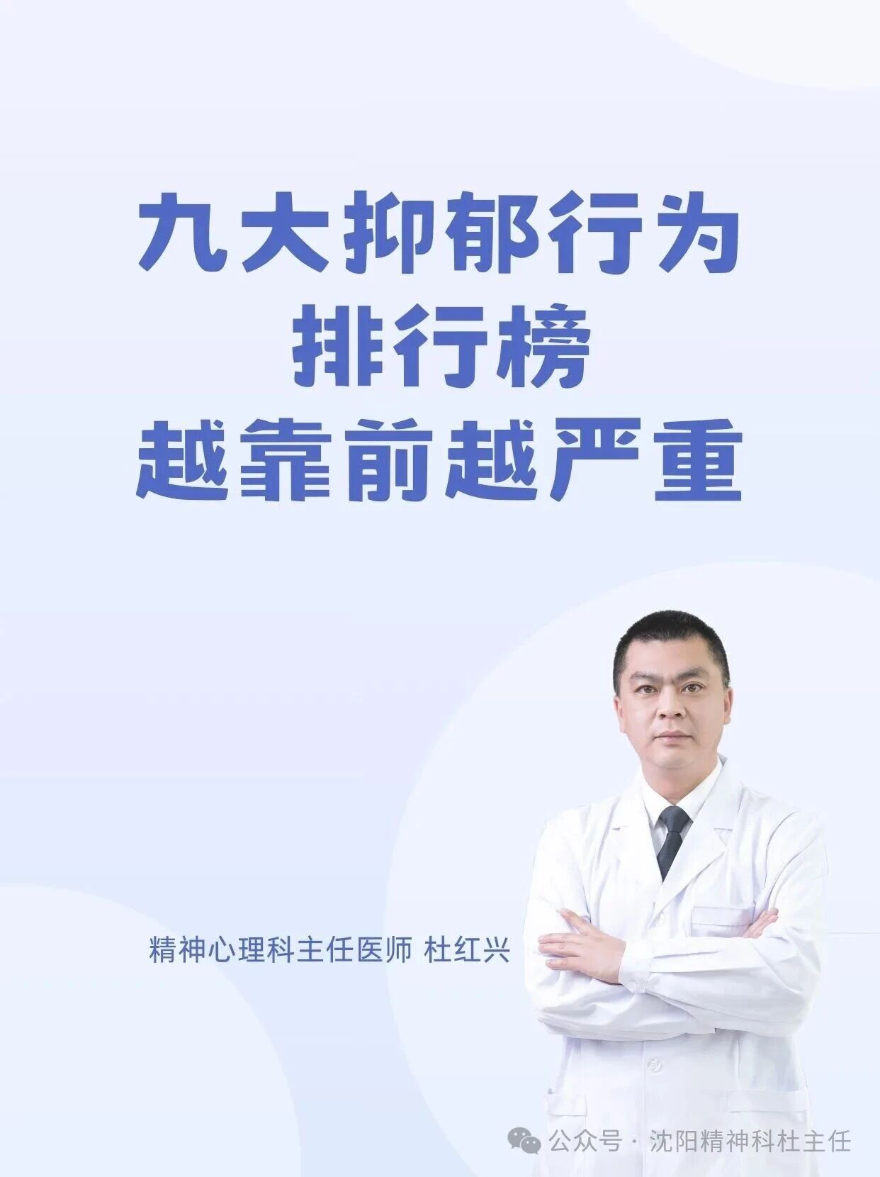 杜红兴 | 九大抑郁行为排行榜 本篇文章来源于微信公众号:沈阳精神科杜主任 预约挂号 发布于 心理 上篇文章: 杜红兴 | 抑郁来临时,身体会喊痛!身上2个部位疼痛当心重度抑郁上身! 下篇文章: 杜红兴 | 这六类人最容易得重度焦虑,看看你是不是焦虑“候选人” 发表回复 取消回复评论 * 显示名称 * 邮箱 * 网站 在此浏览器中保存我的显示名称、邮箱地址和网站地址,以便下次评论时使用。