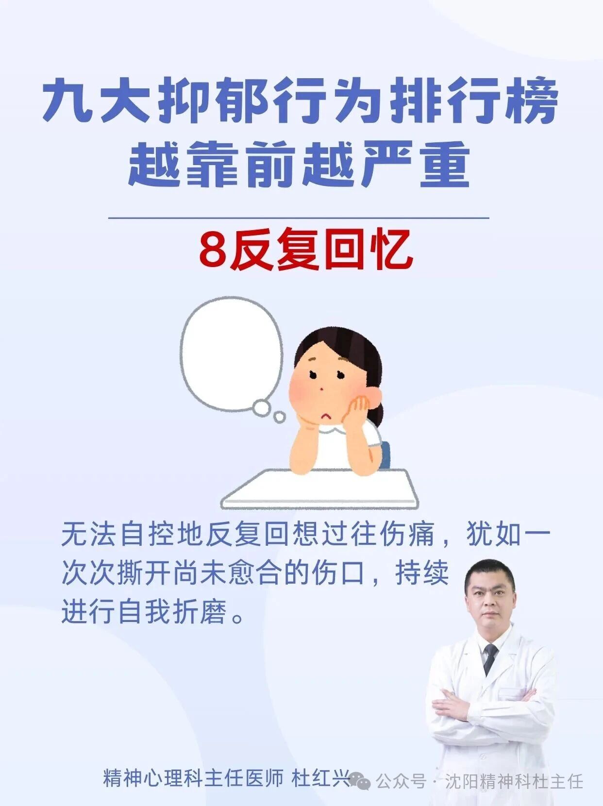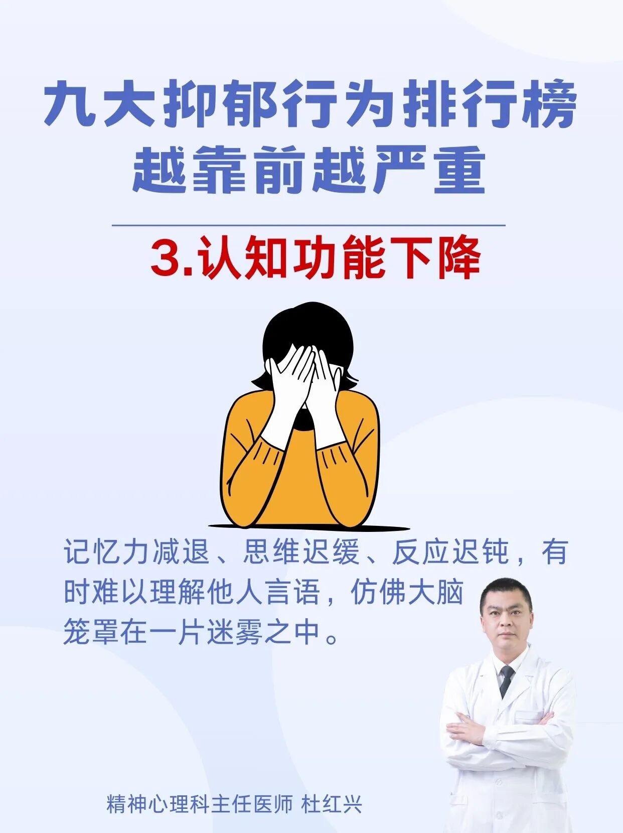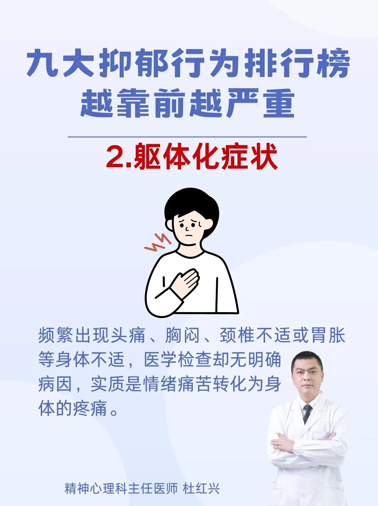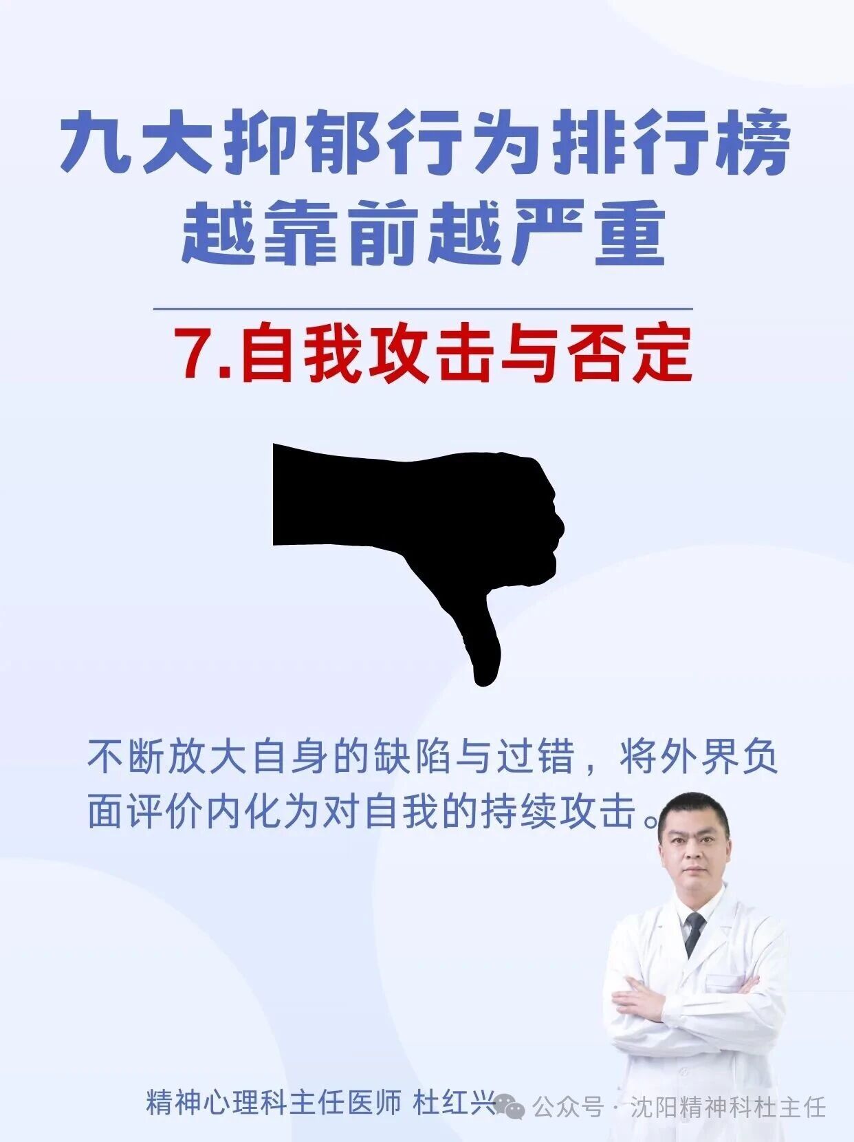 杜红兴 | 九大抑郁行为排行榜 本篇文章来源于微信公众号:沈阳精神科杜主任 预约挂号 发布于 心理 上篇文章: 杜红兴 | 抑郁来临时,身体会喊痛!身上2个部位疼痛当心重度抑郁上身! 下篇文章: 杜红兴 | 这六类人最容易得重度焦虑,看看你是不是焦虑“候选人” 发表回复 取消回复评论 * 显示名称 * 邮箱 * 网站 在此浏览器中保存我的显示名称、邮箱地址和网站地址,以便下次评论时使用。