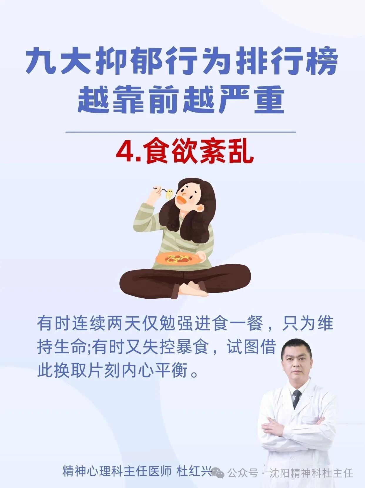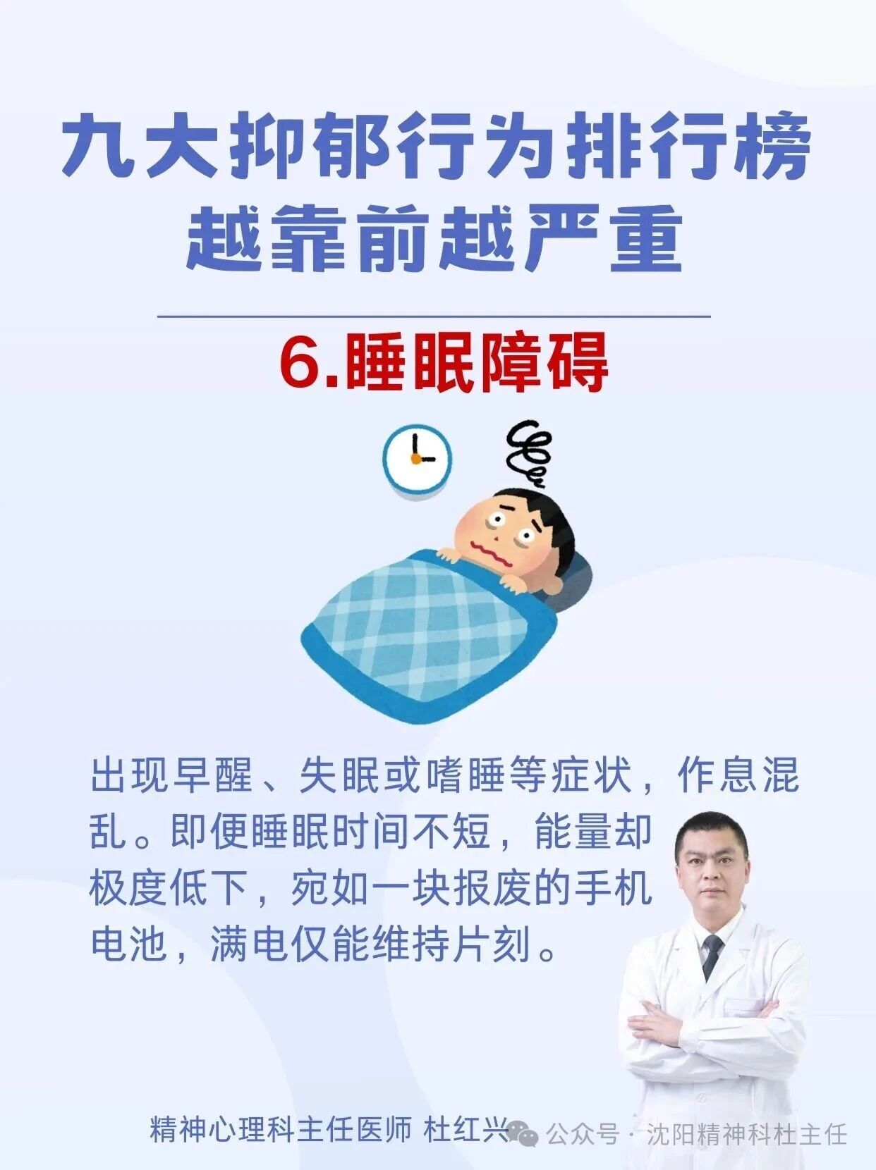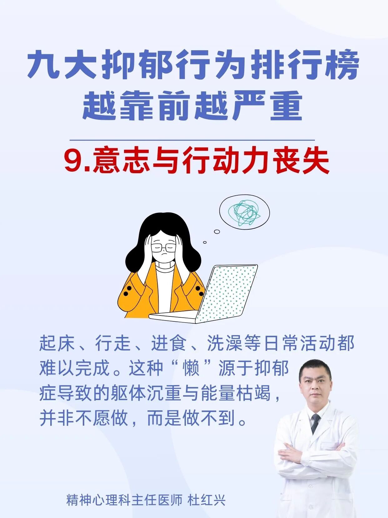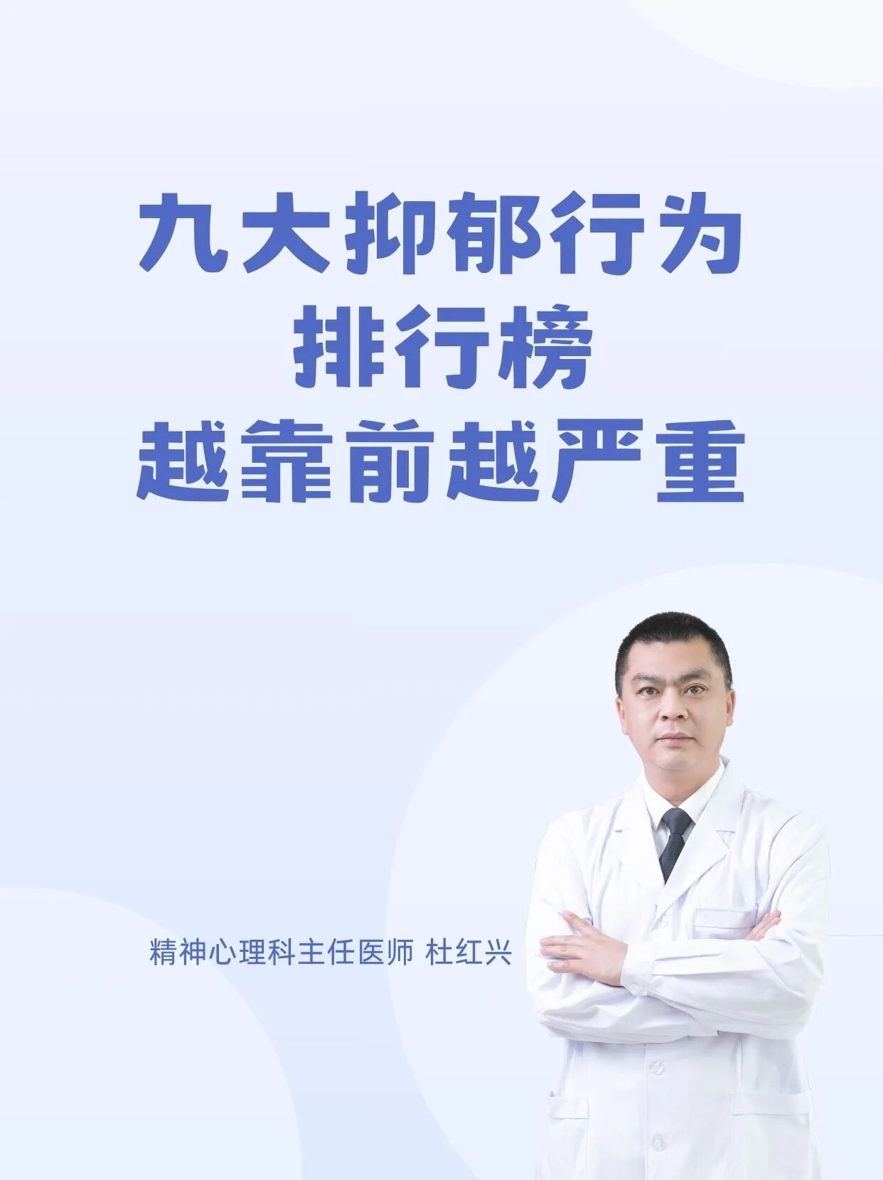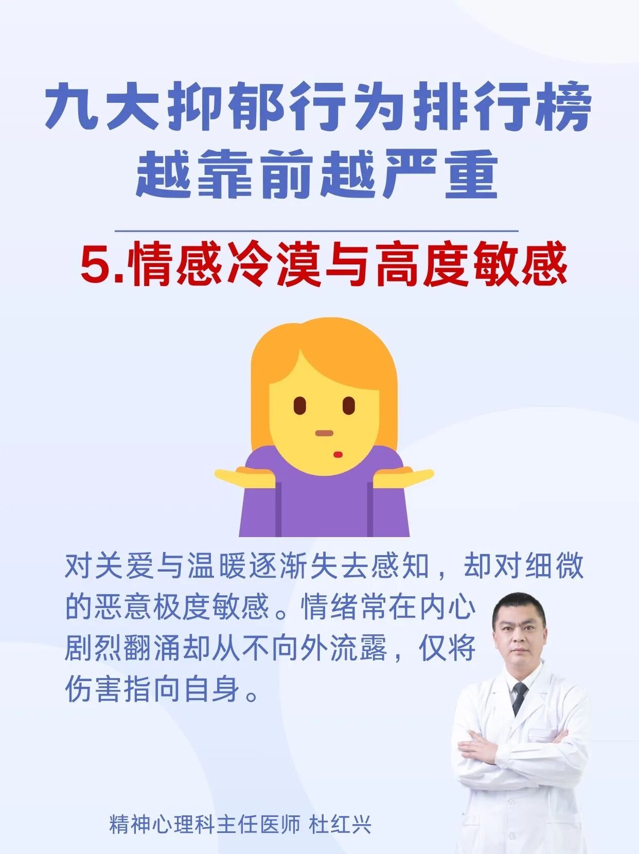 杜红兴 | 九大抑郁行为排行榜 本篇文章来源于微信公众号:沈阳精神科杜主任 预约挂号 发布于 心理 上篇文章: 杜红兴 | 抑郁来临时,身体会喊痛!身上2个部位疼痛当心重度抑郁上身! 下篇文章: 杜红兴 | 这六类人最容易得重度焦虑,看看你是不是焦虑“候选人” 发表回复 取消回复评论 * 显示名称 * 邮箱 * 网站 在此浏览器中保存我的显示名称、邮箱地址和网站地址,以便下次评论时使用。